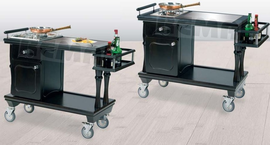 Kolica za pripremu i posluživanje flambiranih jela, ova markantna kolica mogu biti isporučena s jednim ili dva plamenika, kočnice na kotačima standardno, u kolica ulazi mala plinska boca.