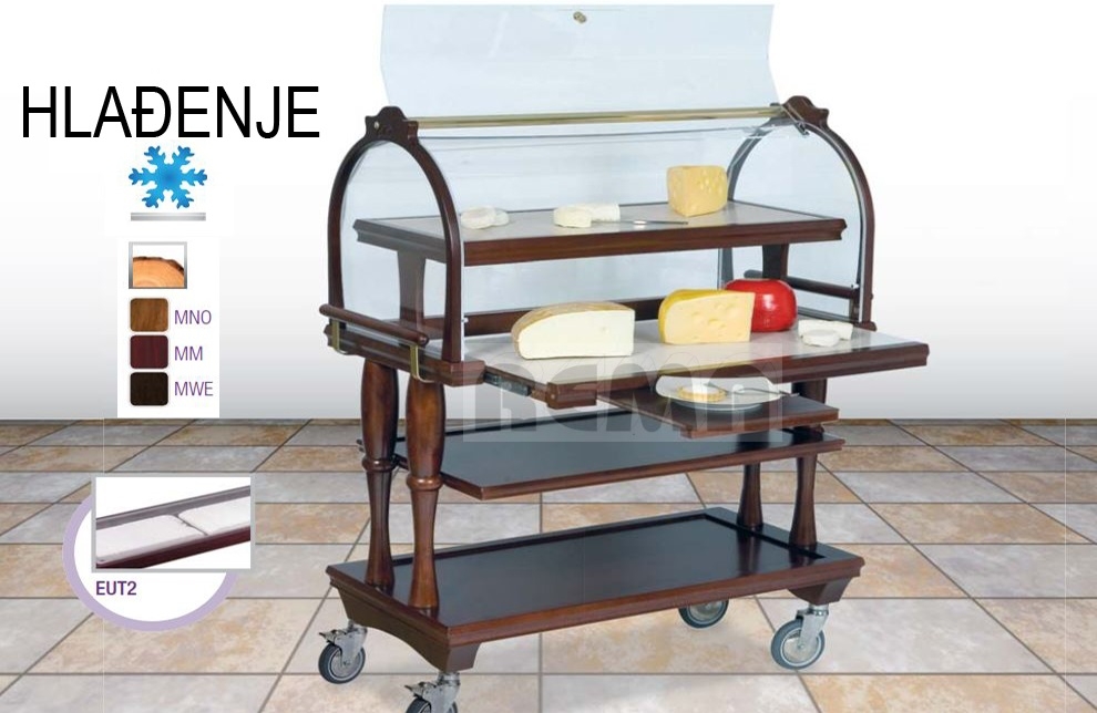 Ugostiteljska rashladna kolica za serviranje sira i boca, rashladna kolica za sale, rashladna kolica za serviranje u hotelu, kolica za serviranje u restoranu, rashladna kolica za serviranje u salama hotela, rashladna konobarska kolica na eutetičke ploče. Ova rashladna kolica spadaju u višu klasu radi profinjenog i elegantnog izgleda te punog drva koji je obrađen na najfiniji način, efektna kolica koja daju dojam lokalu i proizvodima koji su na njima izloženi.