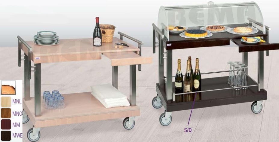 Ugostiteljska servisna kolica sa ladicama ovog modela imaju veći ukupni kapacitet, jaka su i solidna, kotači promjera 125, model bazični bez i model sa plexiglas kupolom, plexiglas je više kvalitete, otporan na habanje, kolica idealna za hotelske sale, restoranske sale i sve vrste restorana koji moraju biti kompletni za brzu uslugu gostiju, kolica mogu prevoziti tanjure, čaše, boce, kolače, torte, ladice koje se izvlače postaju na mjestu posluživanja vrlo praktična.