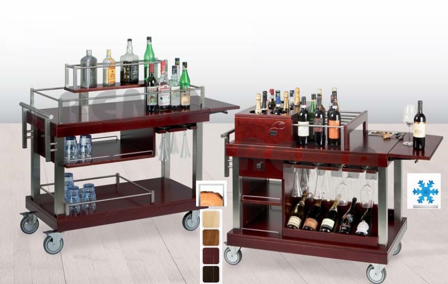 Ugostiteljska kolica varijanta bez i sa hlađenjem na eutetičke ploče za bijelo vino, elegantna kolica od punog drva koja vinima daju naglasak važnosti dižu dojam gostima. Model ima bočnu preklopnu ploču i po želji donju ladicu. Vrlo praktična za sve vrste vina, šampanjca, likera.