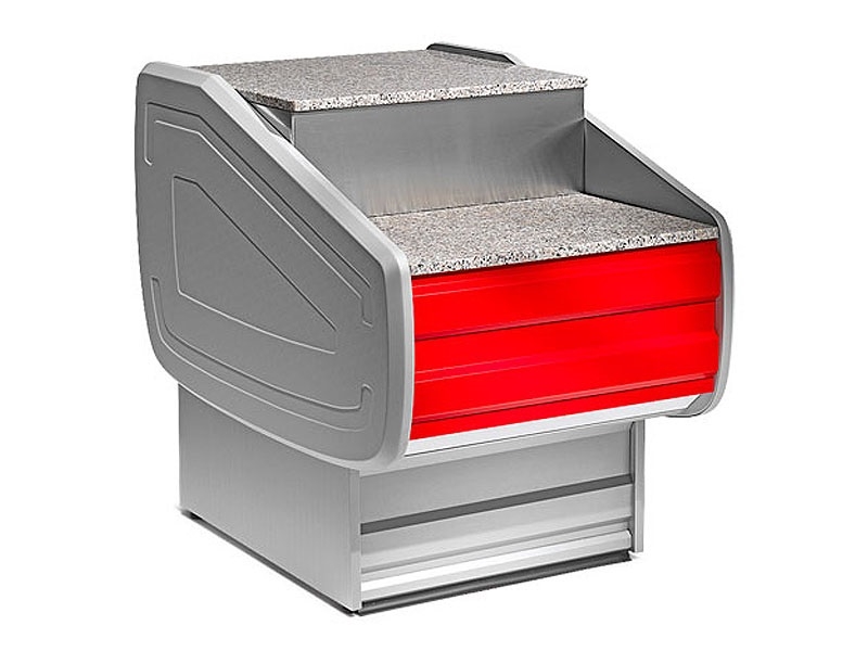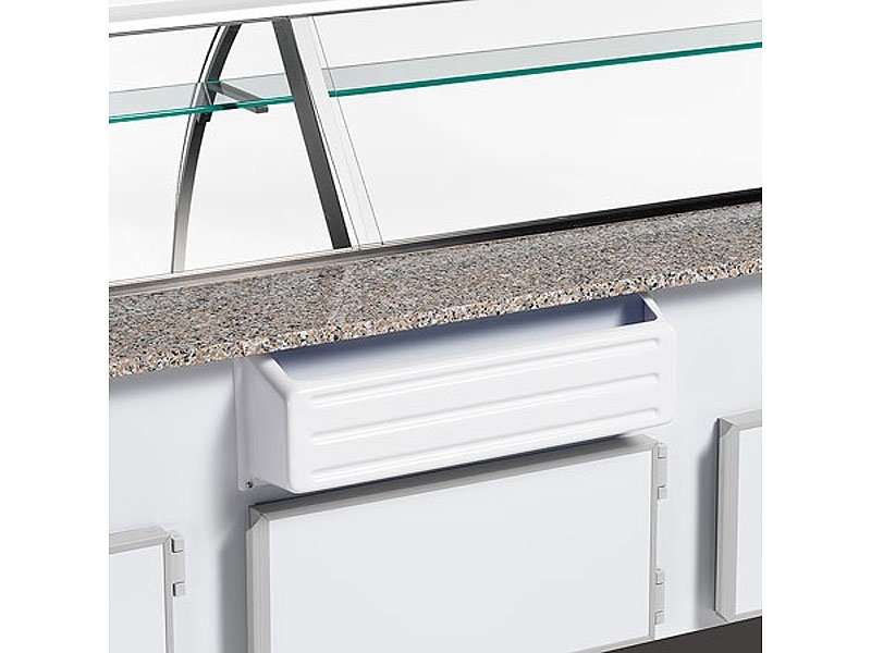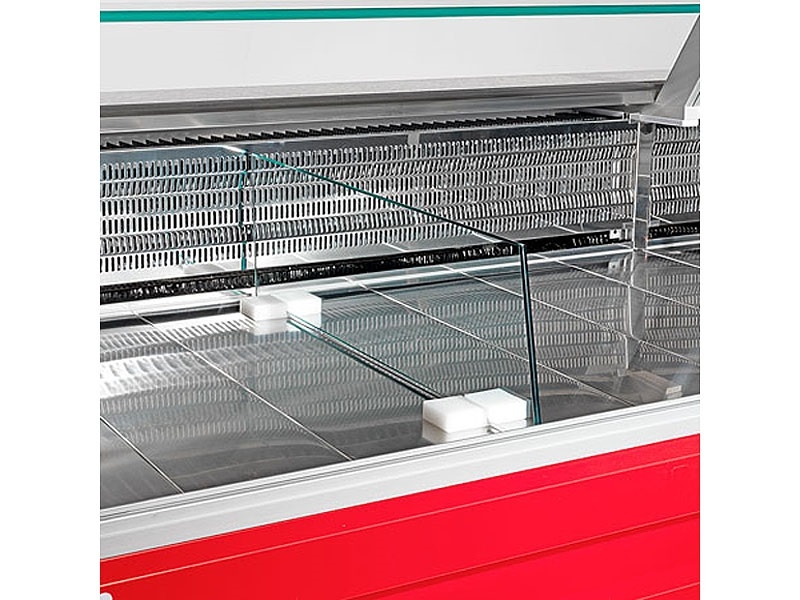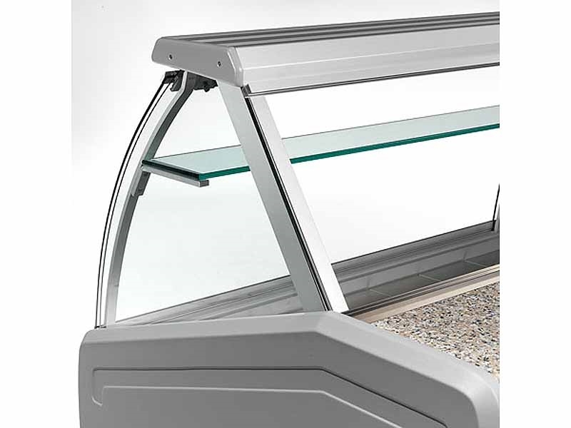Rashladne vitrine za suhomesnate ili mliječne proizvode i sireve, temp. +4/+6°C, dužine 1300, 1500, 2000, 2500, 3000, 3500 ili 4000 mm, ventilirano (dinamično) ili statičko (mirno) hlađenje, sa ili bez skladišnog prostora, sa ravnim ili zaobljenim staklom,osvjetljene, materijal izrade inox AISI 304, sa granitnom radnom površinom, na upit iza plexiglass zatvaranje, HACCAP standardi.
