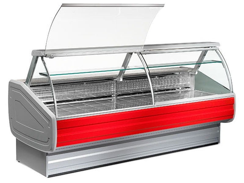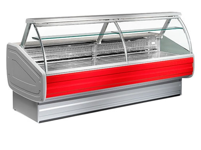 Rashladne vitrine za svježe meso i mesne prerađevine, temp. 0/+2°C, dužine 1300, 1500, 2000, 2500, 3000, 3500 ili 4000 mm, ventilirano (dinamično) ili statičko (mirno) hlađenje, sa ili bez skladišnog prostora, sa ravnim ili zaobljenim staklom, osvjetljene, materijal izrade inox AISI 304, sa granitnom radnom površinom, na upit iza plexiglass zatvaranje, HACCAP standardi.
