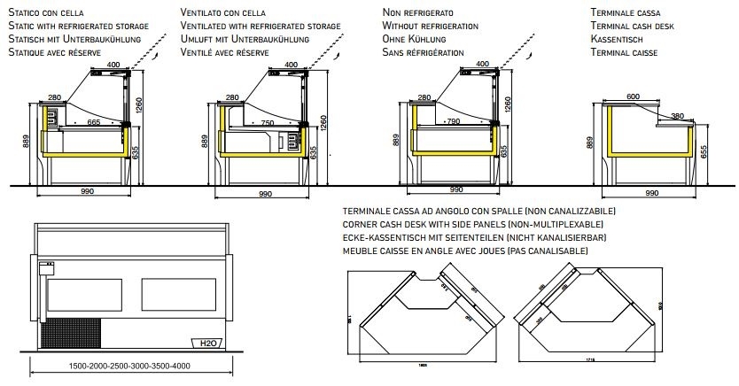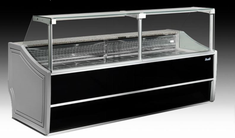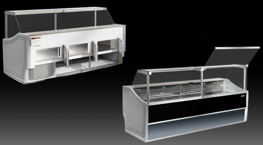 Rashladna vitrina za meso temperaturno područje 0 + 2 °C , namijenjena za srednje i manje mesnice, mogućnost različitih boja, rasvjeta LED za meso, kvalitetna rashladna vitrina s gornjom izložbenom plohom od rostfraj-a (inox) 304, donja komora od rostfraj-a (inox-a) 304, standarnde dužine 100, 150, 200, 250, 300, 350, 400 cm, izrada kutnih elemenata za kasa pult, radna površina od granita, modeli rashladne vitrine za meso PAGODA mogu se isporučiti sa ili bez donje komore.Gornja poslužavna ploha dubina 400 mm.