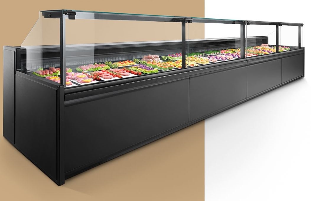 Rashladne vitrine za meso salame sireve dubokog tipa s posebnim rješenjima mirno hlađenje s ujednačenom temperaturom na cijeloj površini izložbenog prostora, trenutno najbolje vitrine za meso za najzahtjevnije mesnice, rasvjeta za meso LED, dizanje stakala pomoću cilindara na gore, lako se održavaju, peru i čiste, pregled robe je idealan, nema odsjaja na staklu. Boje po želji i potrebama mesnice prodavaonice ili delikatesa mesa. Isporučujemo gotove vitrine ili dizajniramo, projektiramo cijelu prodavaonicu prateći najnovija tehnička dostignuća rashlade za optimalno izlaganje, čuvanje i održavanja mesa. Rashladne vitrine za meso mogu biti s ugrađenim motorom ili vanjskim uređajem.