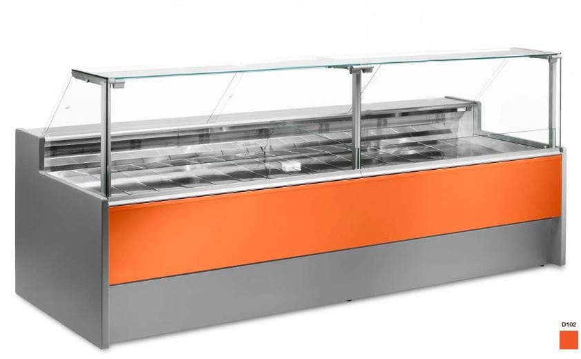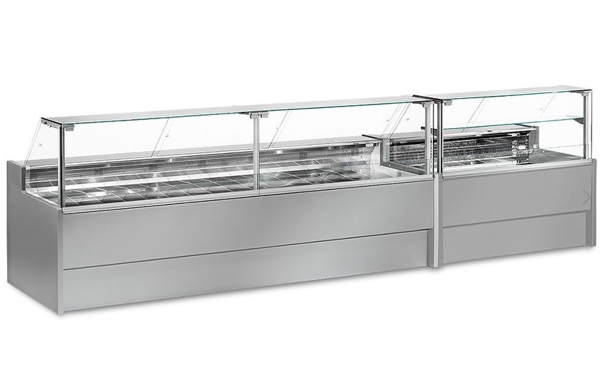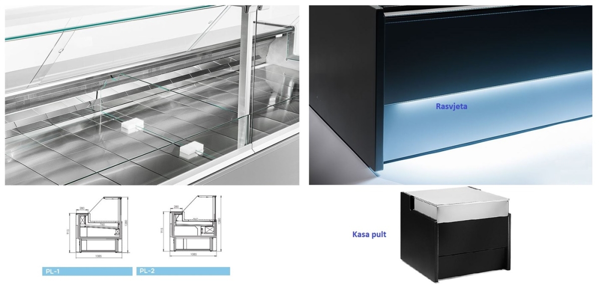 Rashladna horizontalna vitrina JN za prodaju sira, suhomesnatih proizvoda, mlječnih proizvoda, yogurte.Dostupne dužine 1000 mm, 1500 mm, 2000 mm, 2500 mm, 3000 mm. Izložbena površina sva u INOX-u. Proizvodnja kompletno u Italiji, 50 godina tradicije i iskustva u proizvodnji rashladnih vitrina.