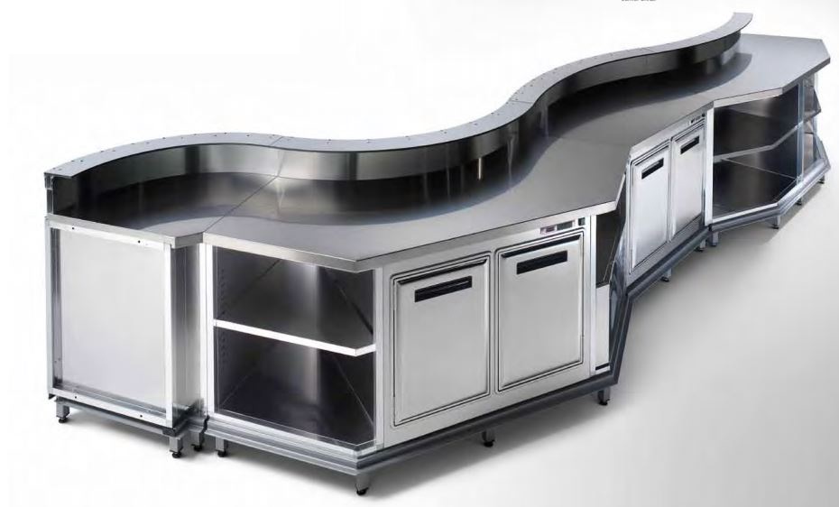 Rahladni šank polugotov za kafe bar, restorane, hotele, konobe, zaobljen od INOX-a 304, 4 vrata s rashladnim komorama i neutralnim elementima za ugradnju ledomata, perilice. Šank od INOX-a s pojačanom strukturom, inox bočno debljine 0,8 mm, gornja radna površina šanka 1.2 mm ili na zahtjev deblji,šank ima nosaše na prednjoj strani i predisponiran je već za nadogradnju prednje i po potrebi bočne maske u različitim dizajnima i izvedbama. Šank izrađujemo za arhitekte točno na milimetar po projektu, izveba šanka je u čvrstoj strukturi, rashladni uređaj u šanku ili odvojen, spojevi šanka i varovi zadovoljavaju sve sanitarne uvjete po HACCAP-u.