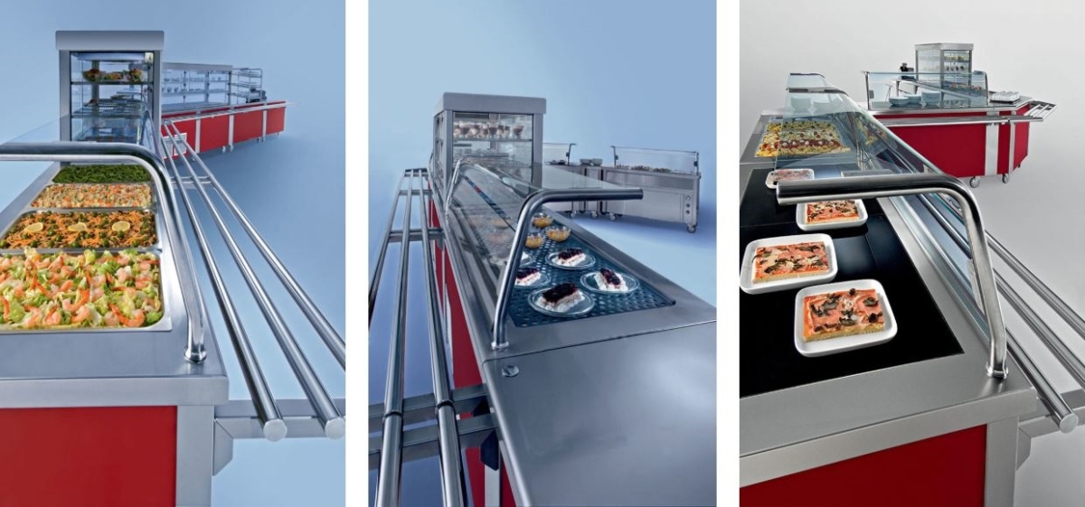 Topli hladni i neutralni elementi od INOX-a, dubina 700 mm ili 800 mm, rubovi vanjski i unutarnji bez oštrih završetaka, kuteva i spojeva, linije u koju spadaju pretinci za kruh i beštek, salvete i tacne, neutralni stol, vitrina hlađena za kolače, hladne salate voćne salate, drop-in elementi grijaći za gotova jela, roštilj za meso ribu ili povrće, vok element za pripremu tradicionalnih jela, bagnomarie, friteza, hladni elementi za gotova jela, samoposlužna rashladna vitrina za piće, kasa pult.U stražnjem dijelu neutralni elementi za tanjure pribor, roštilj s napom, pribor. Linija je kompaktna i čvrsta, lako se čisti i održava, svi elementi na kotačima radi boljeg pristupa mjestima intenzivnom zaprljanja poda.