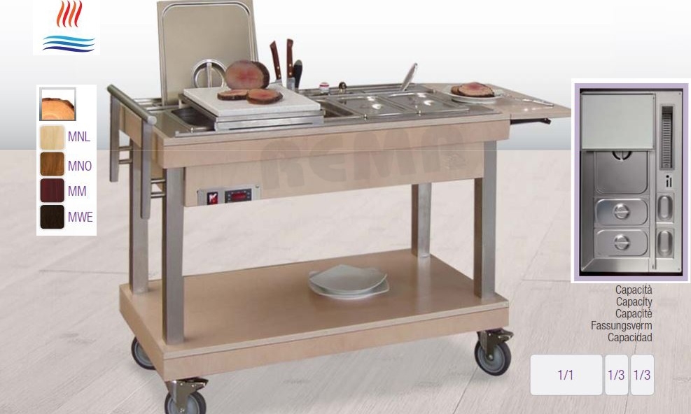 Kolica termička za ugostiteljstvo, topla servisna kolica za razne namjene u konobama, restoranima, topla kolica za sale, kolica za serviranje toplih jela u hotelu, kolica za serviranje toplih jela u restoranu, kolica za serviranje u salama hotela, konobarska topla kolica. Ova kolica spadaju u viši rang, imaju elektronski termostat, vrlo su elegantna i daju odmah gostu dojam kvalitetnog lokala, kolica su izdržljiva, kotači su pojačani, mogućnost GN posuda.
