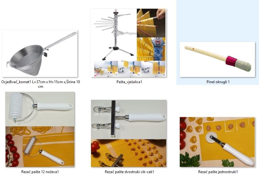 Kutlača, sito za brašno, četka za brašno , vaga precizna za profesionalnu kuhinju, kalup za tjesteninu, nož za paštu tjesteninu, mutilica profesionalna, vješalica za paštu tjesteninu, rezač za paštu tjesteninu, rezač za špagete, valjak nož za rezanje pašte, pomoćni alat za tjesteninu, profesionalni pomoćni alat za pripremu pašte, kalupi za paštu, kalupi za tjesteninu, profesionalni termometar za kuhinju, vješalica za špagete, vješalica za tagliatele, profesionalne špatule za kuhinju.