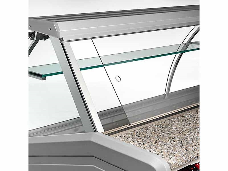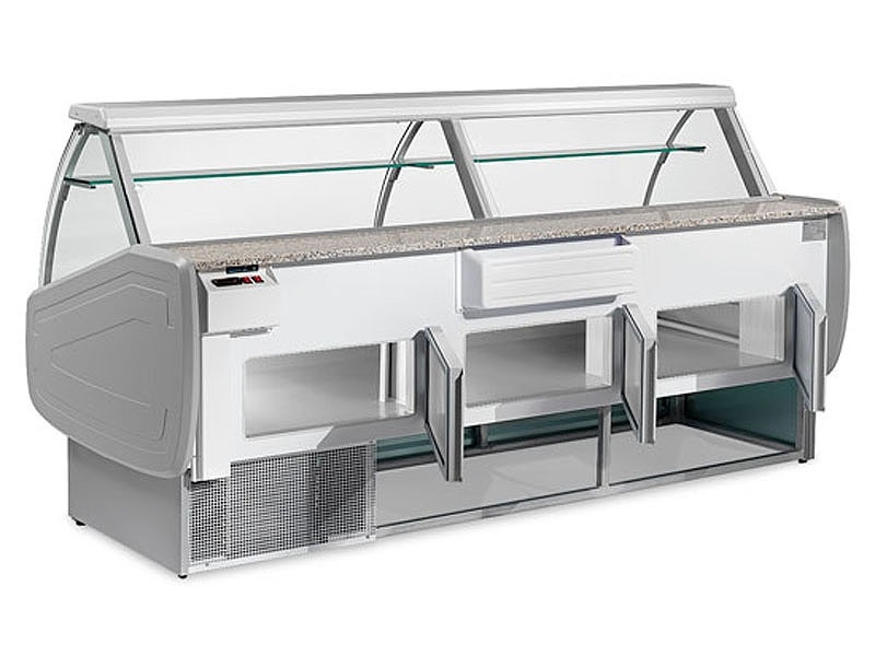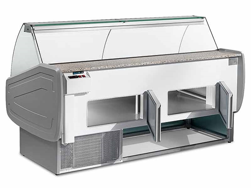 Rashladne vitrine za suhomesnate ili mliječne proizvode i sireve, temp. +4/+6°C, dužine 1300, 1500, 2000, 2500, 3000, 3500 ili 4000 mm, ventilirano (dinamično) ili statičko (mirno) hlađenje, sa ili bez skladišnog prostora, sa ravnim ili zaobljenim staklom,osvjetljene, materijal izrade inox AISI 304, sa granitnom radnom površinom, na upit iza plexiglass zatvaranje, HACCAP standardi.