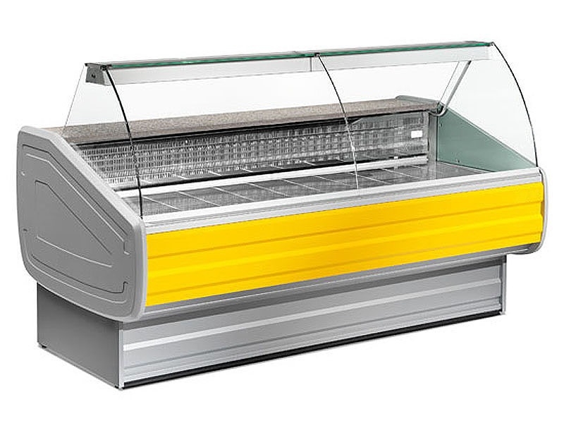 Rashladne vitrine za svježe meso i mesne prerađevine, temp. 0/+2°C, dužine 1300, 1500, 2000, 2500, 3000, 3500 ili 4000 mm, ventilirano (dinamično) ili statičko (mirno) hlađenje, sa ili bez skladišnog prostora, sa ravnim ili zaobljenim staklom, osvjetljene, materijal izrade inox AISI 304, sa granitnom radnom površinom, na upit iza plexiglass zatvaranje, HACCAP standardi.