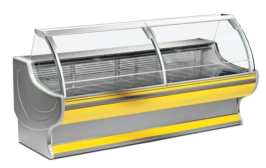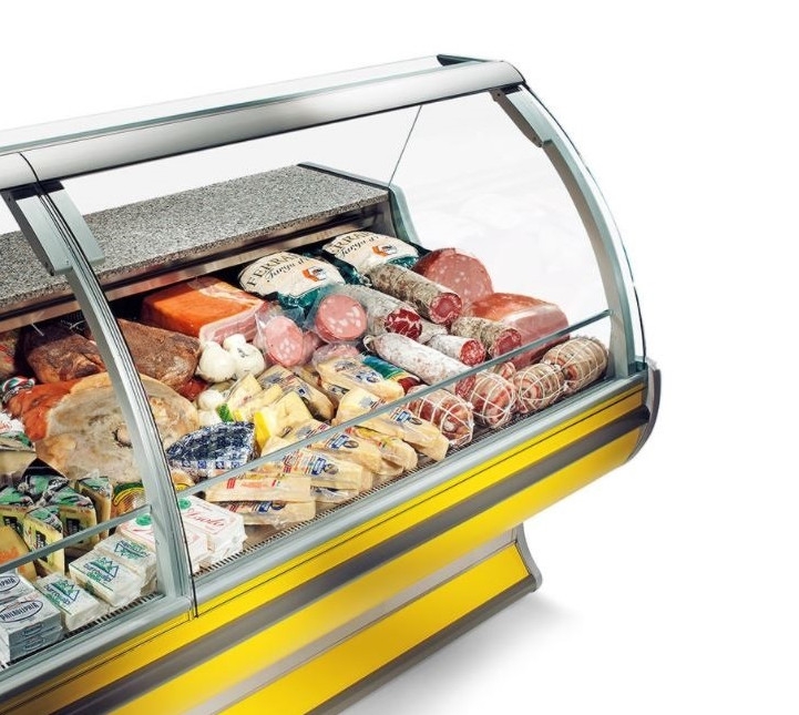 Rashladna vitrina s oblim staklom, otvaranje stakla na dolje ili prema gore, Kvalitetna rashladna vitrina za za prodaju suhomesnatih proizvoda, sireva,mlječnih proizvoda, mesa i gastronomskih proizvoda. Dužine 1500mm, 2000 mm, 2500 mm, 3000 mm, 3500 mm, 4500 mm.