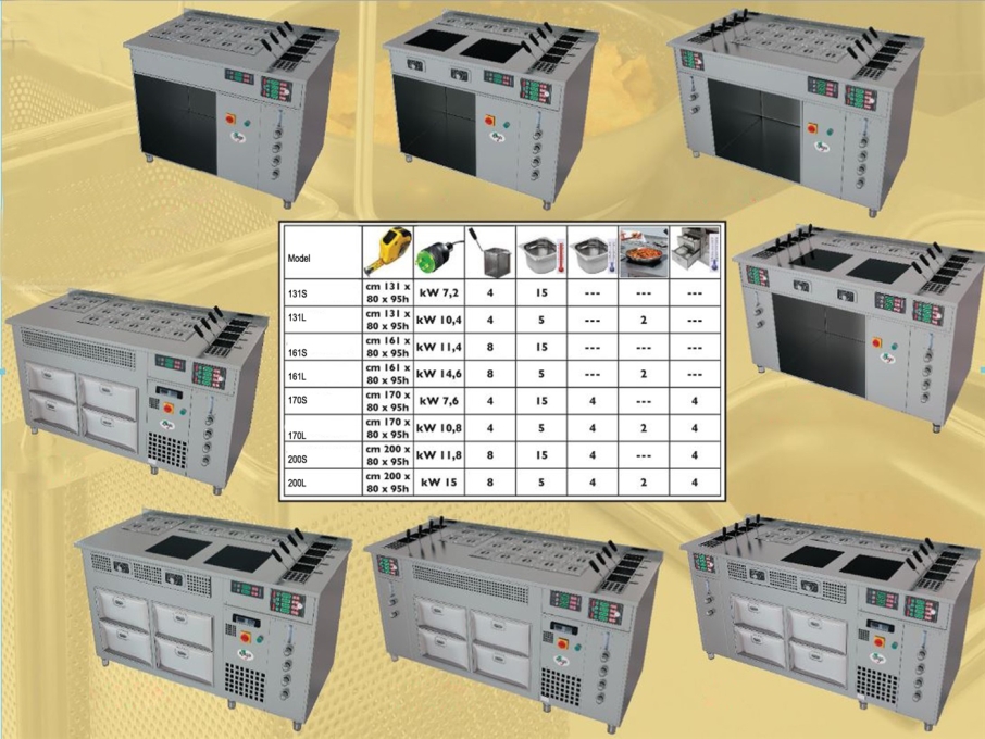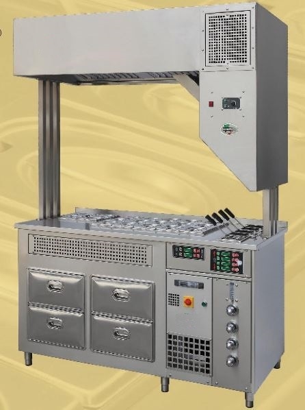 Automatska stanica za kuhanje i pripremu jela od tjestenine, kompletan uređaj koji u sebi ima prostor s banjicama za hladne umake, bagnomarie za tople umake, dvije indukcijske brze ploče za kuhanje,u donjem dijelu 4 ladice hlađene, 4 kuhača pašte s automatskim podizanjem koje se može regulirati po želji. Za šoping centre,fast food restorane i druga prodajna mjesta na prednjem dijelu stanice mogućnost nadograndnje sa prednjom prozirnom sanitarnom fiksnom barijerom koja se istovremeno koristi i kao šank za posluživanje. Razne varijante za razne situacije i potrebe, stanica može biti isporučena s kotačima a rashladni prostor s ladicama može biti zamijenjen spremnicima za vodu i u tom slučaju nema potrebe za stalni priključak na vodovodnu cijev. Mogućnost nadogradnje nape i razne druge varijante na upit